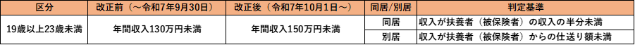 今回の改正により、令和7年10月以降は、19歳以上23歳未満の方について健康保険の被扶養者認定における年間収入基準が150万円未満となります。